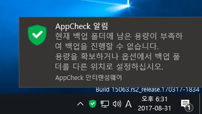 AppCheck 안티랜섬웨어의 자동 백업 기능을 통해 백업이 진행되는 과정에서 "현재 백업 폴더에 남은 용량이 부족하여 백업을 진행할 수 없습니다. 용량을 확보하거나 옵션에서 백업 폴더를 다른 위치로 설정하십시오." 메시지가 생성될 수 있습니다.