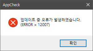 AppCheck 안티랜섬웨어가 설치된 환경에서 사용자가 "AppCheck 정보 → 업데이트 확인" 메뉴를 실행할 경우 "업데이트 중 오류가 발생하였습니다. (ERROR = 12007)" 메시지가 생성될 수 있습니다.