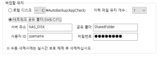 해당 오류가 발생할 경우 자동 백업의 네트워크 공유 폴더 설정값을 정확하게 입력하시기 바랍니다.