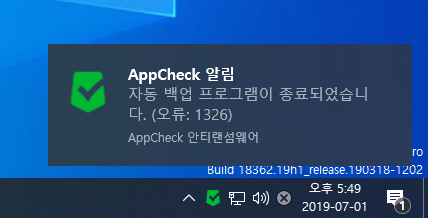 AppCheck 안티랜섬웨어의 자동 백업 기능을 통해 백업이 진행되는 과정에서 시스템 재부팅 또는 앱체크 업데이트 등의 이유로 백업 프로세스(AppCheckB.exe)가 종료되는 경우 "자동 백업이 완료되었습니다. (오류: 1223)" 로그가 기록됩니다.