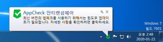 AppCheck 업데이트 시 "최신 버전의 앱체크를 사용하기 위해서는 윈도우 업데이트가 필요합니다. 자세한 사항을 확인하려면 클릭하세요." 메시지가 뜨는 경우 마이크로소프트(Microsoft)에서 제공하는 SHA-2 인증서 관련 패치를 설치해야지 정상적으로 이용하실 수 있습니다.