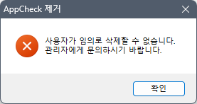 앱체크 제거 시 "사용자가 임의로 삭제할 수 없습니다. 관리자에게 문의하시기 바랍니다." 알림창이 뜹니다.