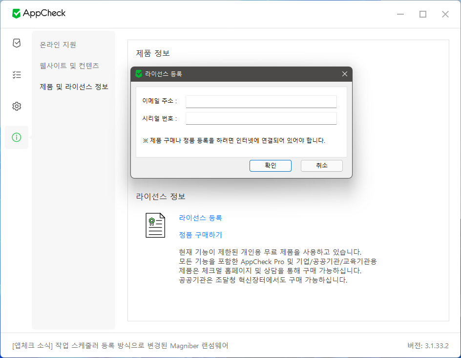 AppCheck 정품 등록은 어떻게 하나요?