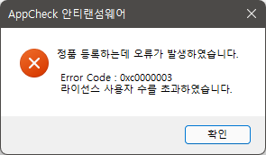 AppCheck 안티랜섬웨어 정품 등록 시 0xc0000003 에러 코드는 라이선스 사용자 수를 초과하였기 때문에 발생합니다.