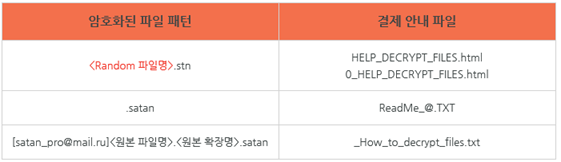 대표적으로 알려진 Satan 랜섬웨어 변종은 위와 같은 형태로 파일 암호화 및 결제 안내 파일을 생성하며, 초기에는 영어와 포르투갈어만 지원했만 현재는 한국어를 포함한 23개 언어로 확대되었다. 또한 최근에는 더욱 광범위한 감염을 목적으로 EternalBlue SMB 취약점을 이용한 전파 기능이 포함하여 유포되고 있다.
