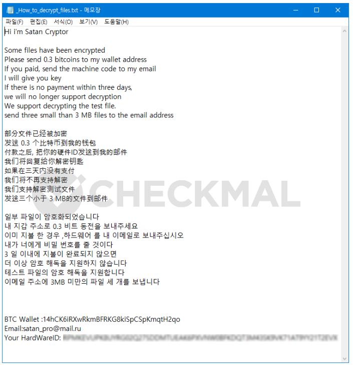 암호화된 파일은 [satan_pro@mail.ru]<원본 파일명>.<원본 확장명>.satan 형태로 변경된다. _How_to_decrypt_files.txt 결제 안내 파일이 생성되어 영어, 중국어, 한국어로 표시된 메시지를 통해 비트코인 결제를 요구한다.