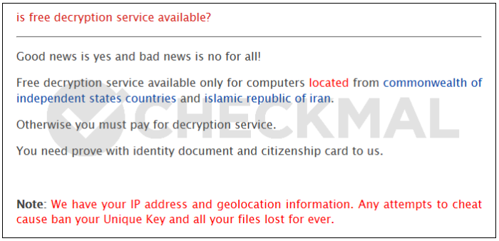 메시지 파일에 나타나는 내용은 특정 국가에 속한 사용자가 Kraken Cryptor 랜섬웨어에 감염된 경우 비트코인 지불 없이 무료로 파일을 복구해준다는 내용이며, 대상 국가로는 러시아 외 16개국이 포함되어 있다.