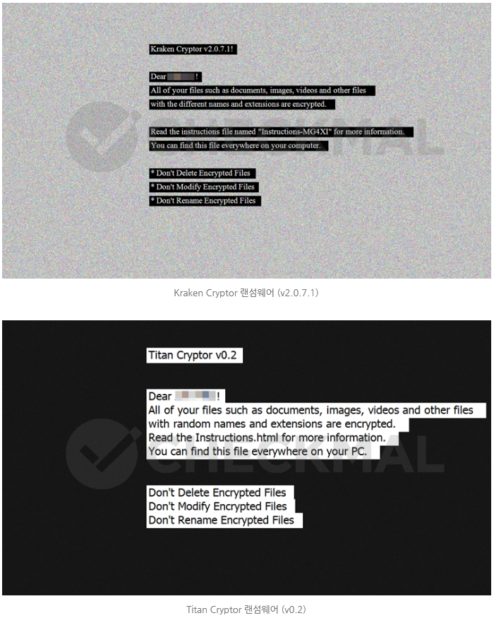 Titan Cryptor 랜섬웨어는 이번 달 초 새롭게 발견됐으며, 랜섬웨어의 암호화 대상 파일은 Kraken Cryptor 랜섬웨어와 동일하게 1cd,3dm,3ds를 포함한 420개 파일 확장명에 대해 암호화가 진행된다. 파일 암호화 후 교체되는 바탕화면 배경 파일도 동일하고, 표시되는 문구도 매우 유사하다.