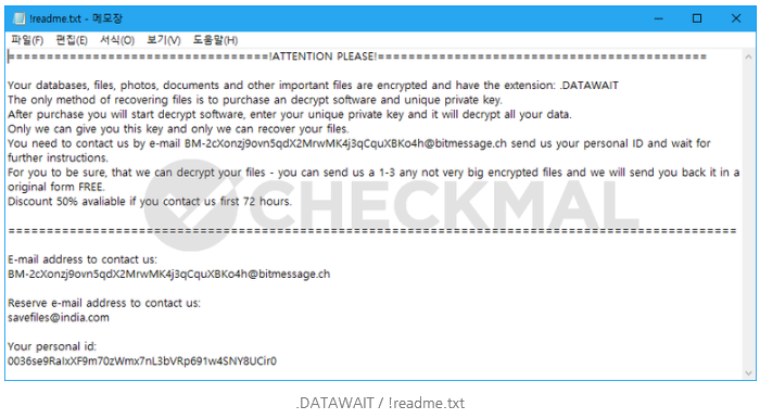 안티랜섬웨어 전문 기업 체크멀(대표 김정훈)은 Stop 랜섬웨어 변종이 유포되고 있어 주의가 필요하다고 14일 밝혔다.