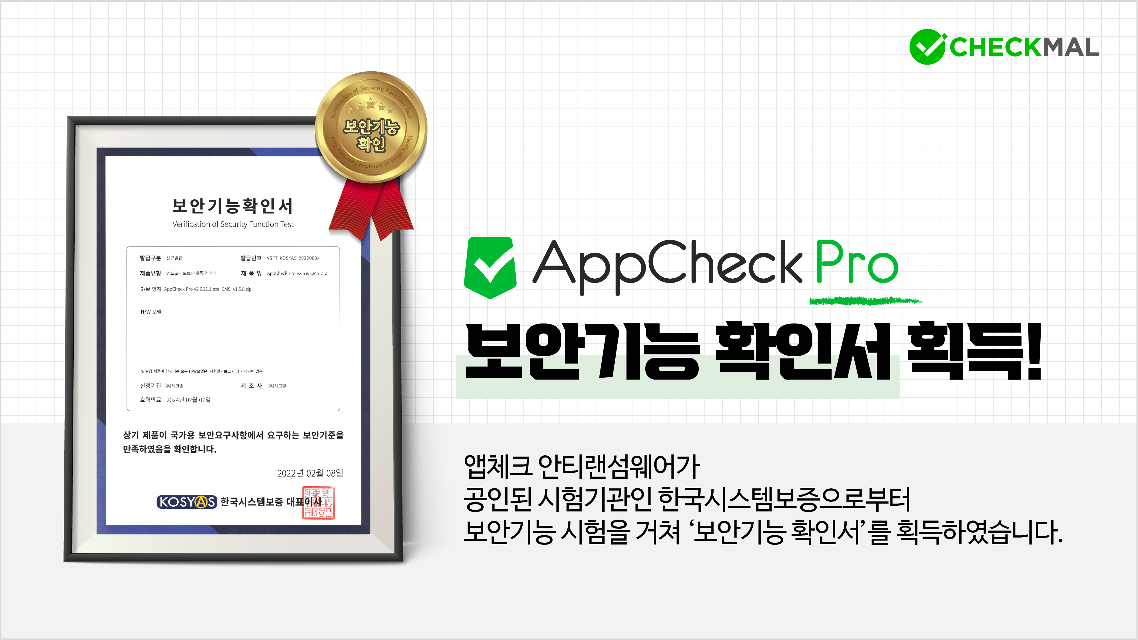 체크멀(대표 김정훈)이 자사의 안티랜섬웨어 솔루션 ‘AppCheck Pro’에 대한 보안기능 확인서를 2022년 2월 8일 획득했다고 밝혔다.