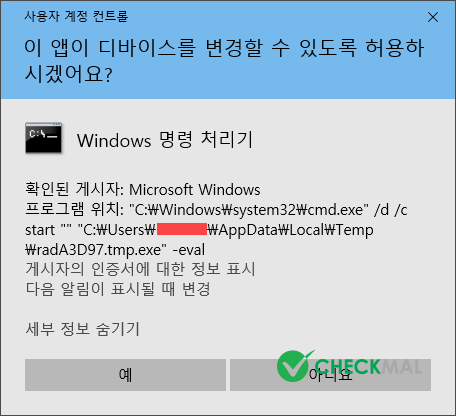 다운로드된 악성 파일은 "%Temp%\rad[5자리 Random].tmp.exe" 파일 형태(MD5 : 8cab5f9faaac876425ae33678c2f8521 - AhnLab V3 : Win-Trojan/Cerber.Gen)로 생성 및 실행되며 최초 동작 시 ["C:\Windows\system32\cmd.exe" /d /c start "" "C:\Users\%UserName%\AppData\Local\Temp\radD66E8.tmp.exe" -eval] 명령어 실행을 위한 사용자 계정 컨트롤(UAC) 창이 생성되므로 절대로 허용하는 일이 없도록 하시기 바랍니다.