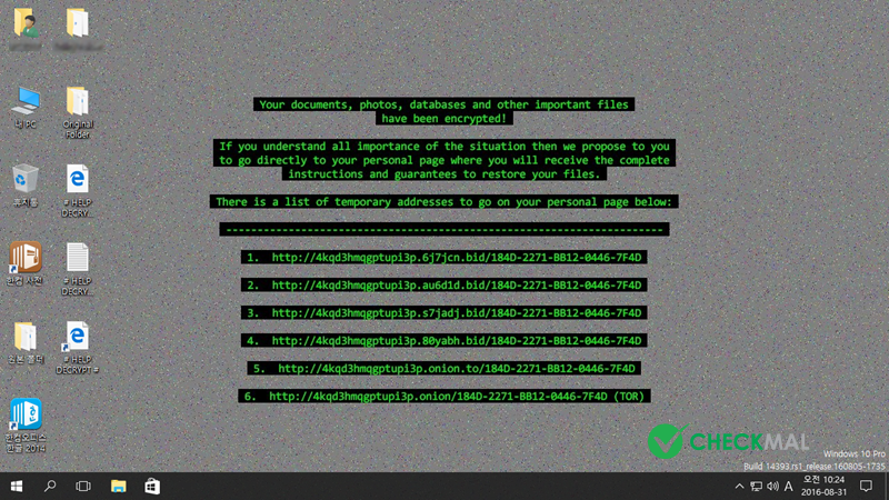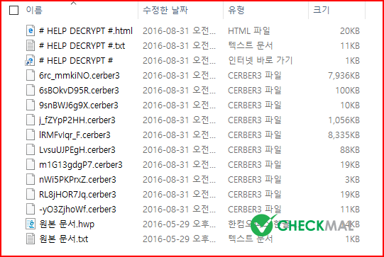 2016년 3월 최초 등장하여 .cerber 파일 확장명으로 암호화 후 텍스트 음성 변환(TTS) 기능을 이용하여 여성 목소리로 암호화 사실을 안내하는 Cerber 랜섬웨어는 2016년 8월 초 .cerber2 확장명으로 변화를 시도하였습니다.(※ .cerber2 랜섬웨어 동영상 보기 : https://www.checkmal.com/page/resource/video/?detail=read&idx=117)