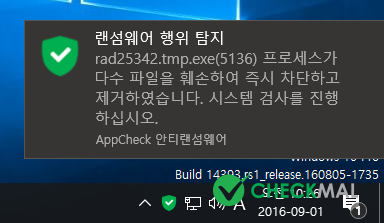 위와 같이 불특정 다수 또는 기업을 상대로 유포되는 메일에 동봉된 악성 스크립트 파일 실행 시 감염되는 .cerber3 파일 확장명으로 암호화하는 Cerber 랜섬웨어 행위에 대하여 AppCheck 안티랜섬웨어 제품에서는 암호화 행위 차단 및 제거와 동시에 일부 암호화된 파일을 자동 복원하여 고객을 보호하고 있습니다.(※ .cerber3 랜섬웨어 동영상 보기 : https://www.checkmal.com/page/resource/video/?detail=read&idx=140)