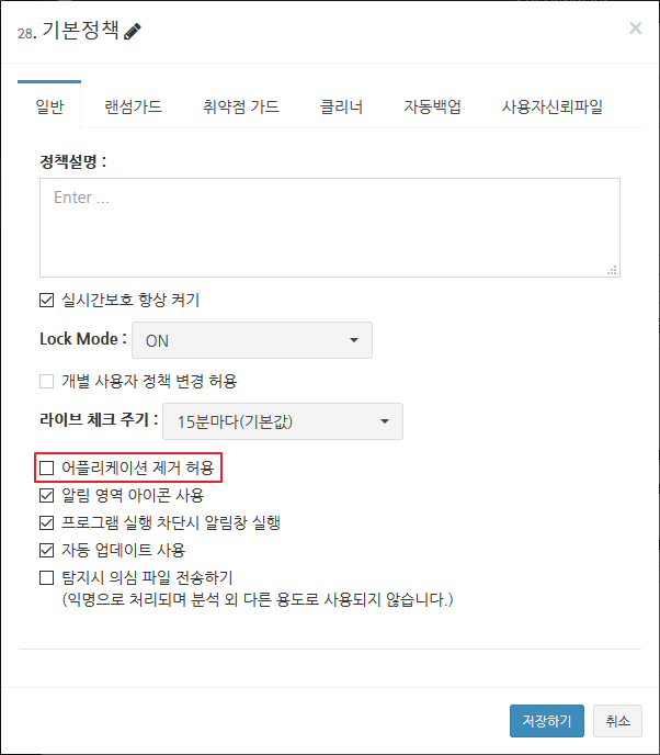 1. CMS 관리 콘솔에서 사용 중인 정책을 수정하여, “어플리케이션 제거 허용”을 해제합니다.