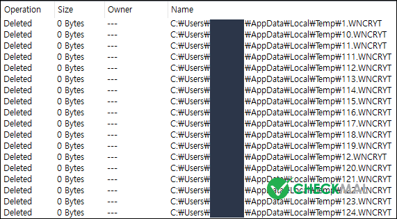 WannaCryptor 랜섬웨어는 파일 암호화 과정에서는 암호화 대상 원본 파일을 그대로 유지하며 암호화가 완료되는 시점에서 원본 파일을 자동 삭제하여 복구할 수 없도록 하며, 암호화 과정에서 임시 생성된 .WNCRYT 파일은 임시 폴더(%Temp%)로 <숫자>.WNCRYT 형태로 이동한 후 자동 삭제 처리합니다.