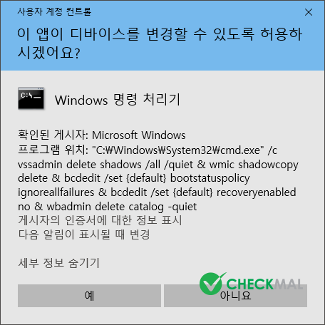 파일 암호화 완료 후 사용자에 의한 시스템 복원 및 복구 옵션 기능을 이용할 수 없도록 다음과 같은 명령어를 통해 VSS(볼륨 섀도 복사본 서비스) 및 부팅 복구 옵션을 삭제합니다.