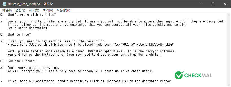 그 외에도 @Please_Read_Me@.txt 랜섬웨어 결제 안내 파일 생성을 통해 지불 방법을 안내하고 있으며, 바탕 화면 배경을 @WanaDecryptor@.bmp 이미지 파일로 변경합니다.