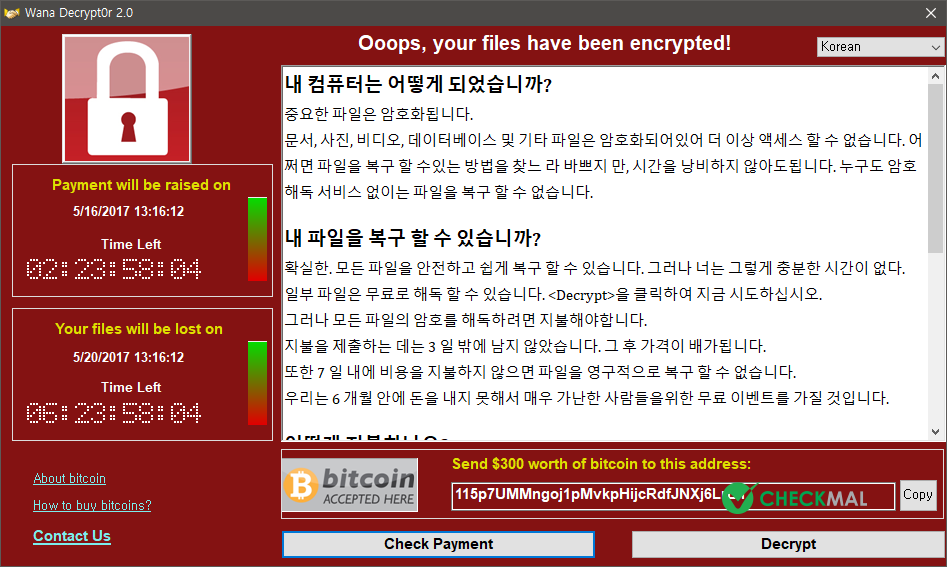 최종적으로 생성된 "Wana Decrypt0r 2.0" 메시지 창은 사용자 운영 체제 언어에 따라 28개 언어로 표시되며, 일정 시간 내에 비트코인(Bitcoin)을 지불하도록 안내하고 있습니다.