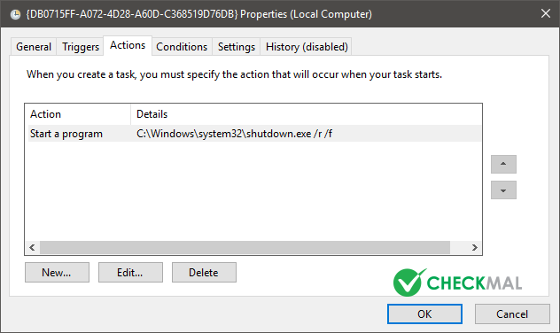 After the infection and MBR modification has completed, Petya Ransomware adds the command to reboot system after 1 hour. "schtasks /Create /SC once /TN "" /TR "C:\Windows\system32\shutdown.exe /r /f" /ST <Specific Time>"