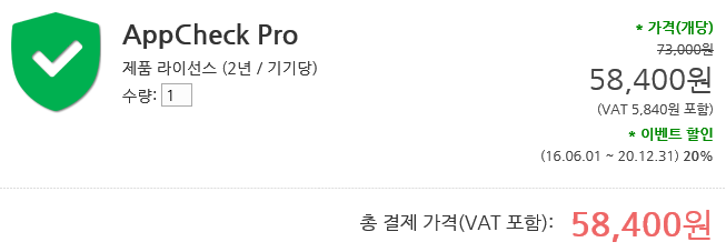 이에 좀 더 저렴하게 AppCheck Pro를 사용하실 수 있게 기존 1년 제품외에 2년 제품을 20% 할인된 가격으로 새롭게 출시하였습니다.