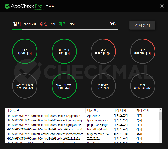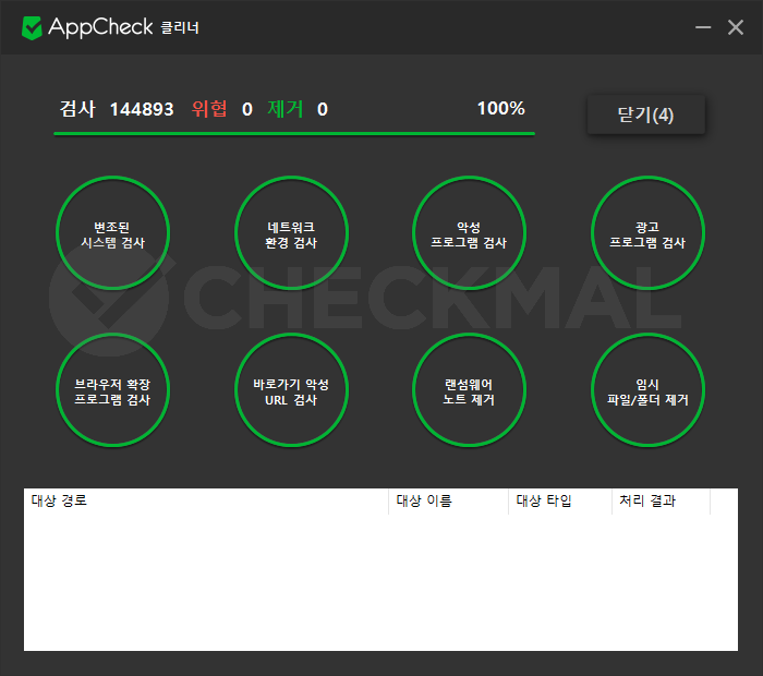 AppCheck 클리너 검사 중 탐지된 항목은 자동으로 삭제 처리가 이루어지므로 사용자가 추가적으로 처리할 필요는 없습니다.