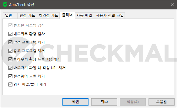 각 검사 항목에 대한 세부적인 선택은 AppCheck 옵션의 클리너 항목에서 사용자가 선택적으로 체크하여 검사 여부를 결정하실 수 있습니다.