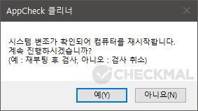 AppCheck 클리너 검사 중 변조된 시스템 검사 영역에서 탐지가 발생할 경우에는 시스템 재부팅 후 자동 재검사를 하도록 안내하고 있으므로 절차에 따라 검사를 진행하시기 바라며, 재부팅 이후에는 자동으로 클리너 기능이 재실행되어 검사가 진행됩니다.