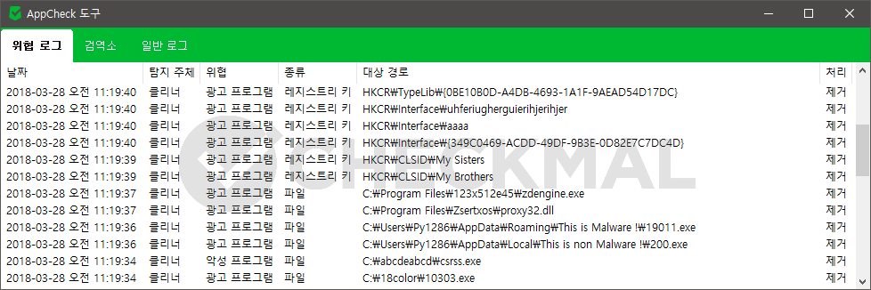 클리너 검사 완료 후 검사 결과에 대한 자세한 사항은 AppCheck 도구의 위협 로그에서 확인할 수 있으며, 검역소 항목에서는 제거된 항목에 대한 복원 기능도 제공하고 있습니다.