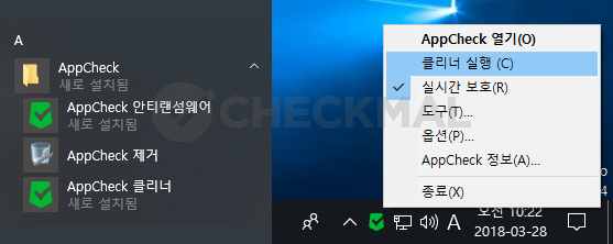 또한 AppCheck 클리너 기능 실행의 편의를 위해 앱체크 메인 화면에서 제공하는 클리너 검사 메뉴 외에 프로그램 및 작업 표시줄 아이콘에 표시된 메뉴에서도 클리너 실행이 가능하도록 메뉴를 추가하였습니다.