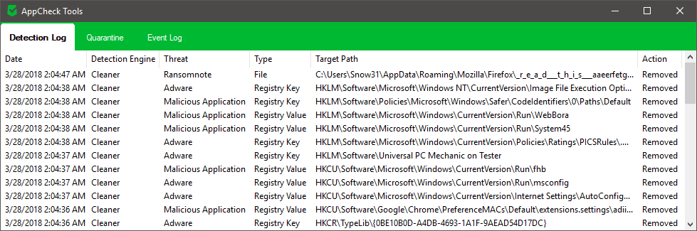You may find out more information about the scanner results after the scaning process is completed. This can be found in the threat log of AppCheck tool, which also provides restore function for removed items.