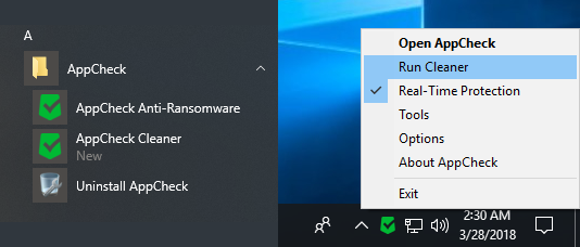 For your convenience of accessing AppCheck Cleaner, we also added menus on the program and taskbar icons.